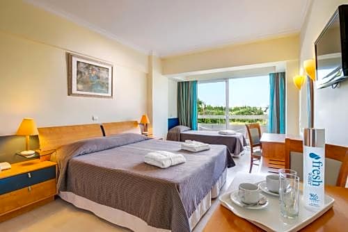 One-bedroom spacious, air-conditioned apartment with garden views from its balcony or terrace. It offers: -a well-equipped kitchenette - 2 LCD TV sets with satellite channels -a hairdryer, bathrobes and slippers -free Wi-Fi. This room type is located in the Beachfront wing of the resort.