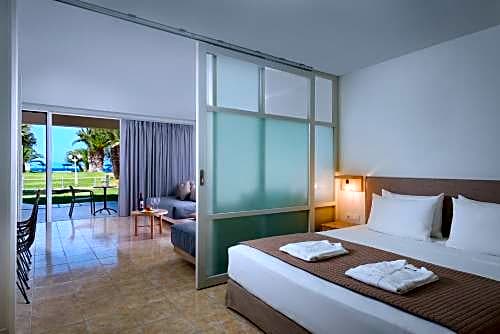 Exclusively located on a front line position at the ground floor, these luxurious apartments feature self-catering amenities as well as 1 king sized double bed and 3 sofa beds in the separated via sliding doors living room. They come enhanced with turn down service, 2 LCD TV sets with USB port and satellite channels, pillow menu service, coffee/tea making facilities, bathrobes, slippers and furnished terrace with sun loungers. This room type is located in the Beachfront wing of the resort.